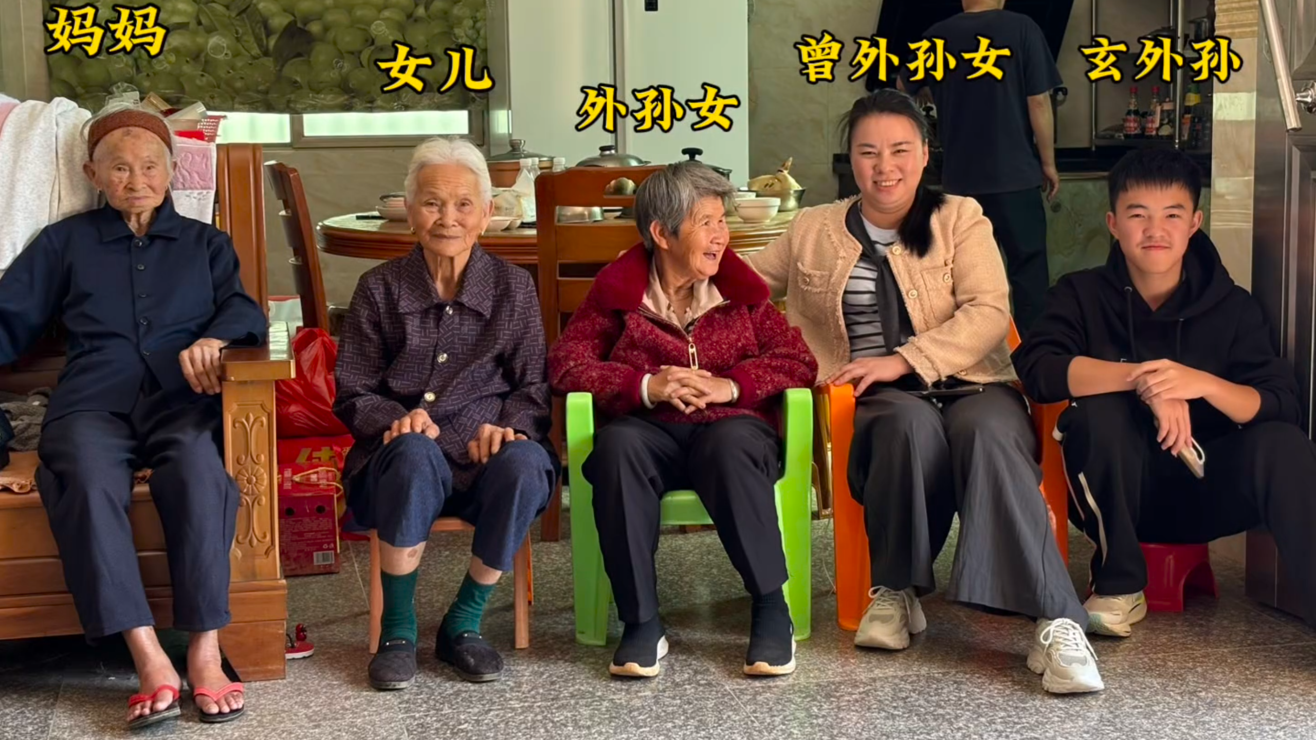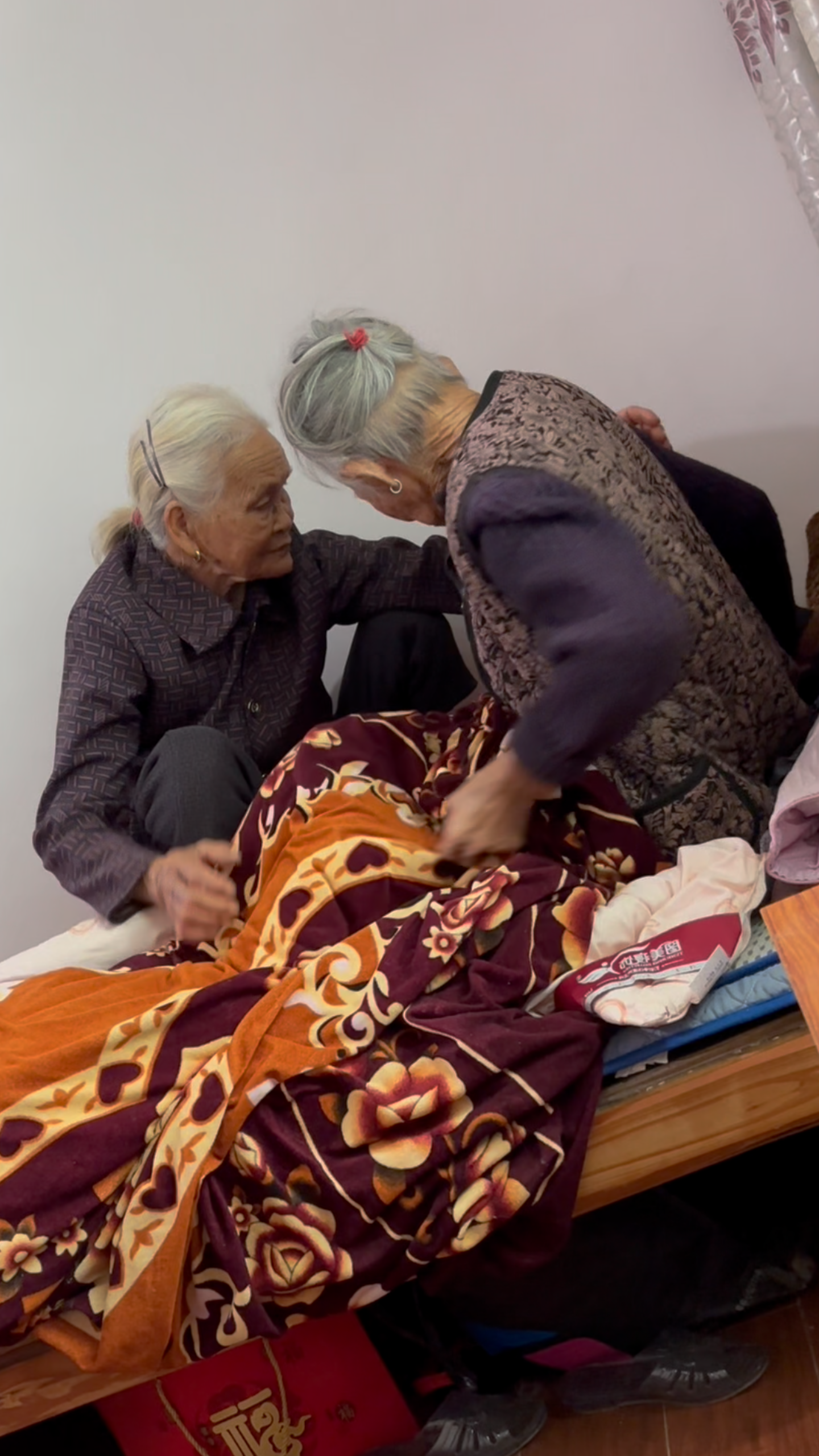 在陈女士的镜头里,曾定格下这样一个温情瞬间:113岁的奶奶坐累了想要躺下,91岁的大姑便贴心地坐在床边,伸手轻轻扶着奶奶的头,生怕老人磕碰到。