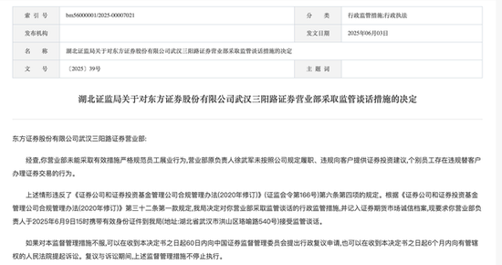 2025年6月3日,湖北证监局对东方证券武汉三阳路证券营业部采取监管谈话的行政监管措施。经调查,该营业部未能采取有效措施严格规范员工展业行为,营业部原负责人徐武军未按照公司规定履职、违规向客户提供证券投资建议,个别员工存在违规替客户办理证券交易的行为。