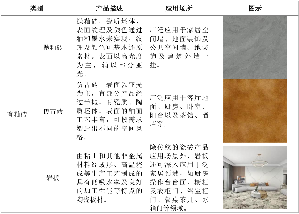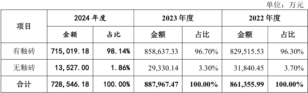 2024年,公司收入按产品类别可分为两大板块,分别为有釉砖(71.50亿元,占2024年总收入的 97.62%)、无釉砖(1.35 亿元,占2024年总收入的1.85%)。2022年至 2024年间,有釉砖产品始终是公司的核心产品及主要收入来源,其销售收入占比稳定在 95%以上。