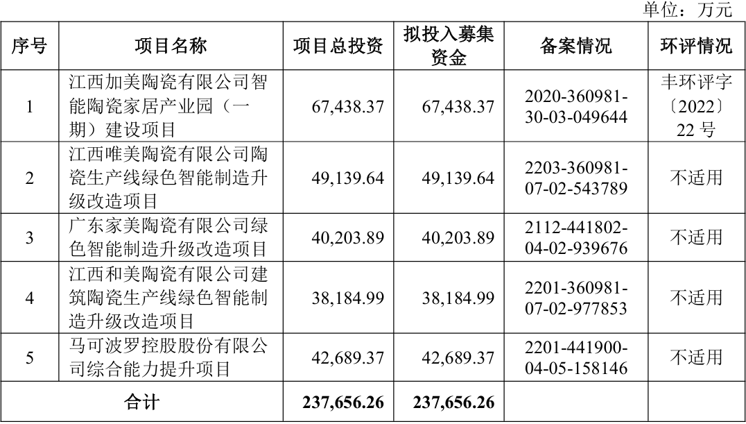本此拟募资用途:项目总投资资金23.77亿,其中6.74亿用于江西加美陶瓷有限公司智能陶瓷家居产业园(一 期)建设项目,4.91亿用于江西唯美陶瓷有限公司陶瓷生产线绿色智能制造升级改造项目、4.02亿用于广东家美陶瓷有限公司绿 色智能制造升级改造项目、3.82亿用于江西和美陶瓷有限公司建 筑陶瓷生产线绿色智能制造升级改造项目、4.27亿用于马可波罗控股股份有限公 司综合能力提升项目,具体项目如下: