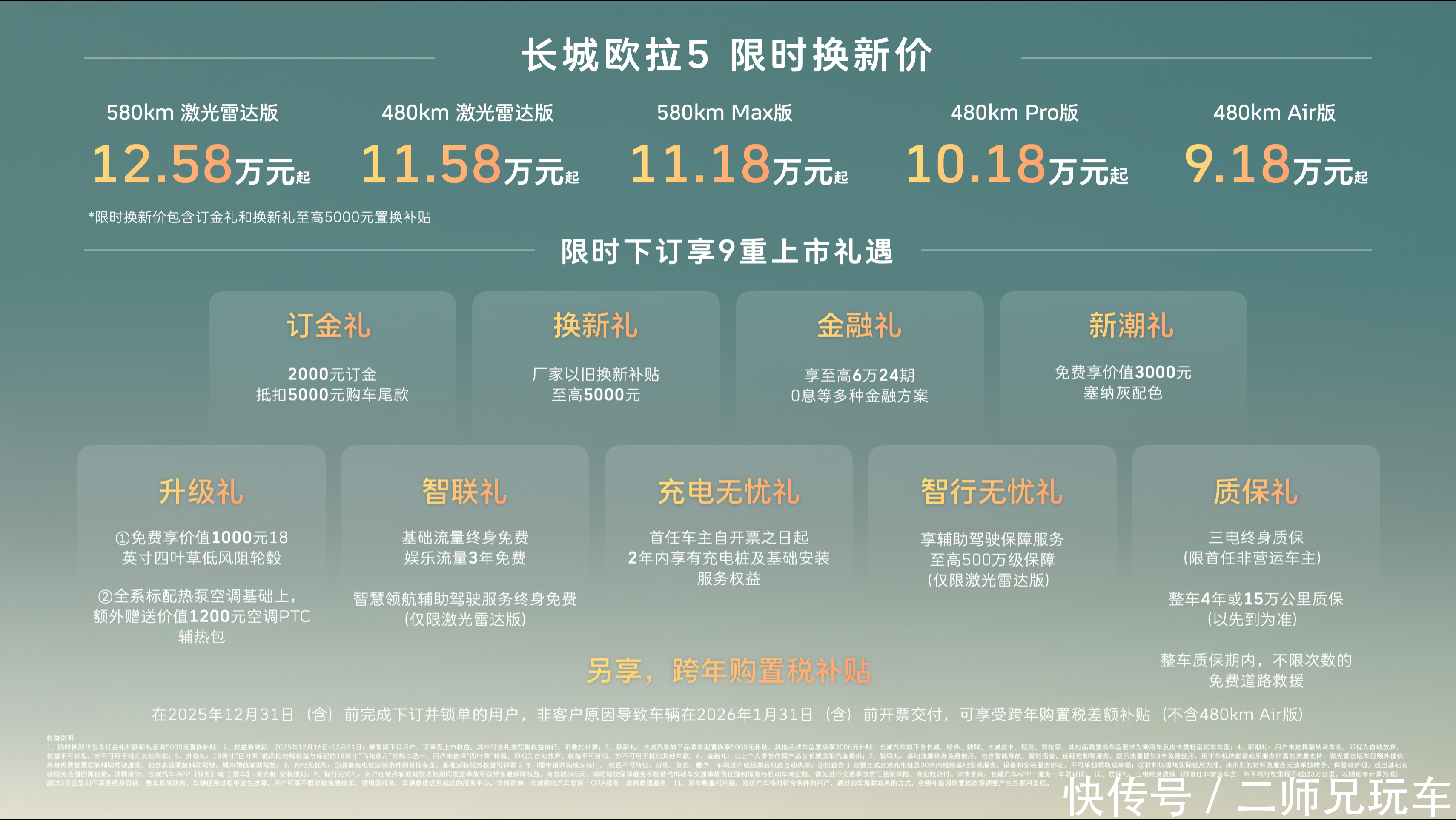 【中国·保定】2025年12月16日——今日,长城汽车欧拉品牌全新A级纯电SUV——长城欧拉5正式上市。新车共推出5款配置,建议零售价区间为 9.98万至13.38万元配资可信股票配资门户,限时换新价9.18万元起(限时换新价包含“订金礼”和“换新礼”至高5000元以旧换新补贴)。为回馈广大用户的热爱与支持,即日起至2025年12月31日,用户下订并锁单即可尊享包含订金礼、换新礼、智行无忧礼在内的9重上市好礼,以及跨年购置税补贴(不含480km Air版)等丰厚购车权益。凭借诚意十足的价格权益与越级产品力,长城欧拉5致力于成为全球年轻用户的“严选搭子”。