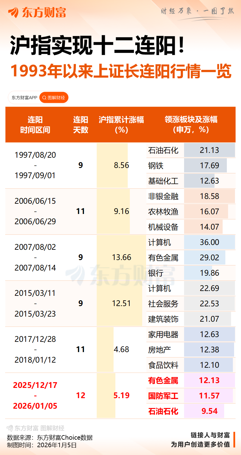沪指2025年12月17日至2026年1月5日实现日线12连阳,创1993年以来最长连阳纪录。此前该阶段最高为11连阳(2006年、2017-2018年两次出现)。